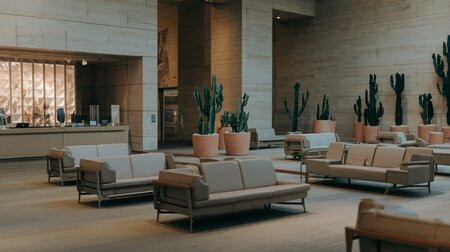 (зона ожидания) /imagine prompt: come up with a waiting room in the Deserted Museum, the place should be modern, spacious, sofas, grow cacti in pots, as decoration, a counter for meeting visitors