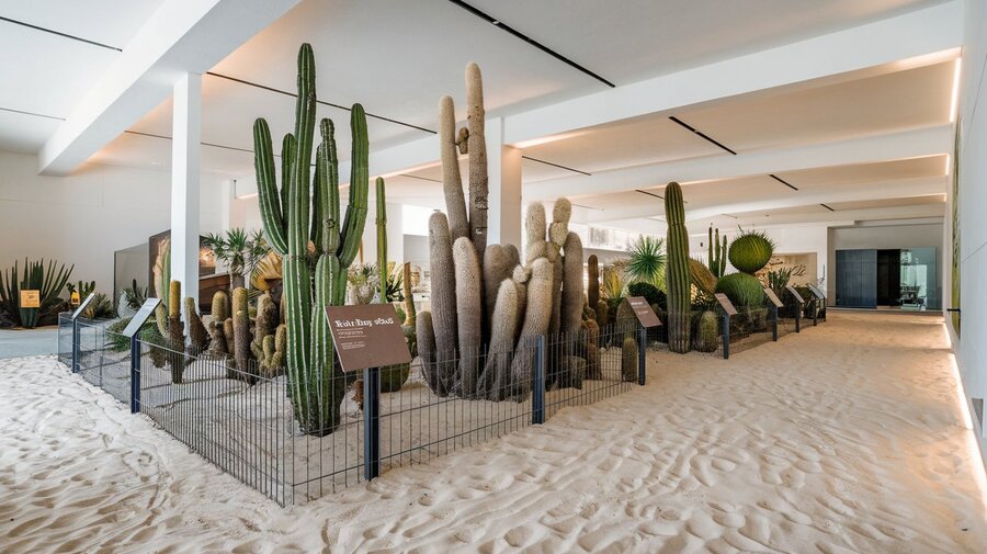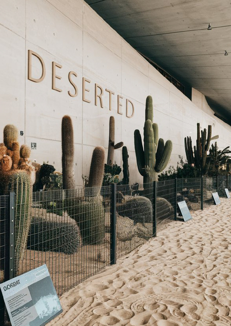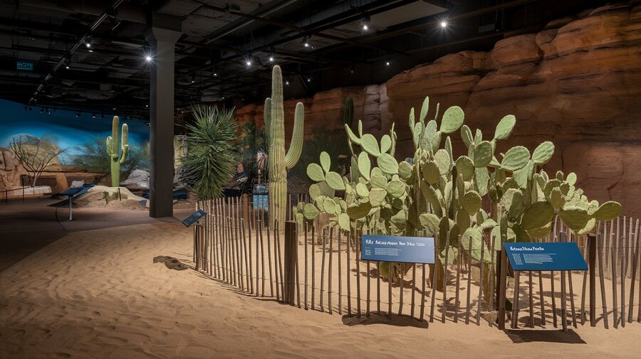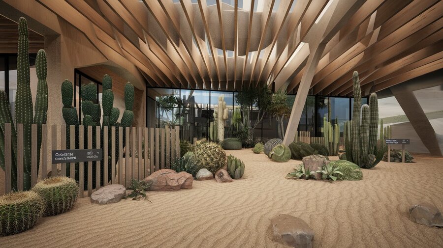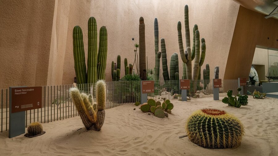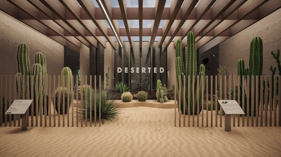 (все изображения) /imagine prompt: come up with a space for the desert museum DESERTED, the space should be modern, there needs to be sand on the floor, cacti growing, but behind the fence, as exhibits, signs near the cacti that indicate what the cactus is called