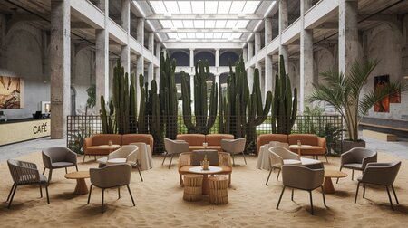 (кафе) /imagine prompt: come up with a cafe in the Deserted Museum, the place should be modern, there should be sand on the floor, chairs, tables, sofas, cacti should grow, but behind the fence, as decoration