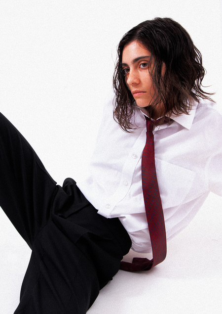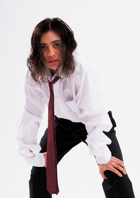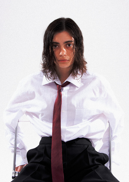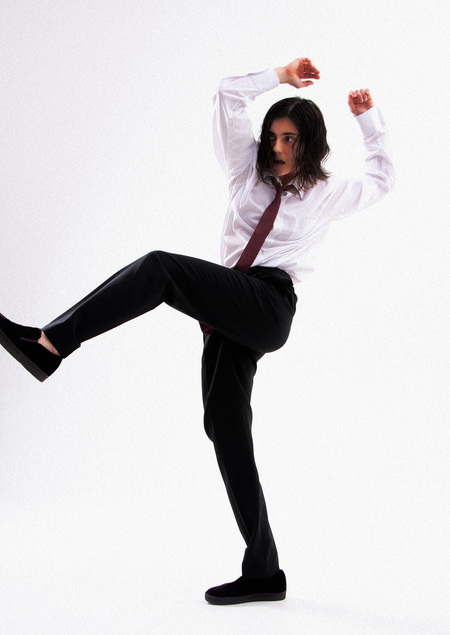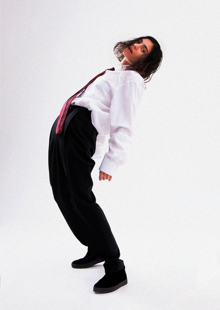 Съемка посвящена гендерной игре. Хрупкая девушка в «мужском костюме», которая готова доминировать.