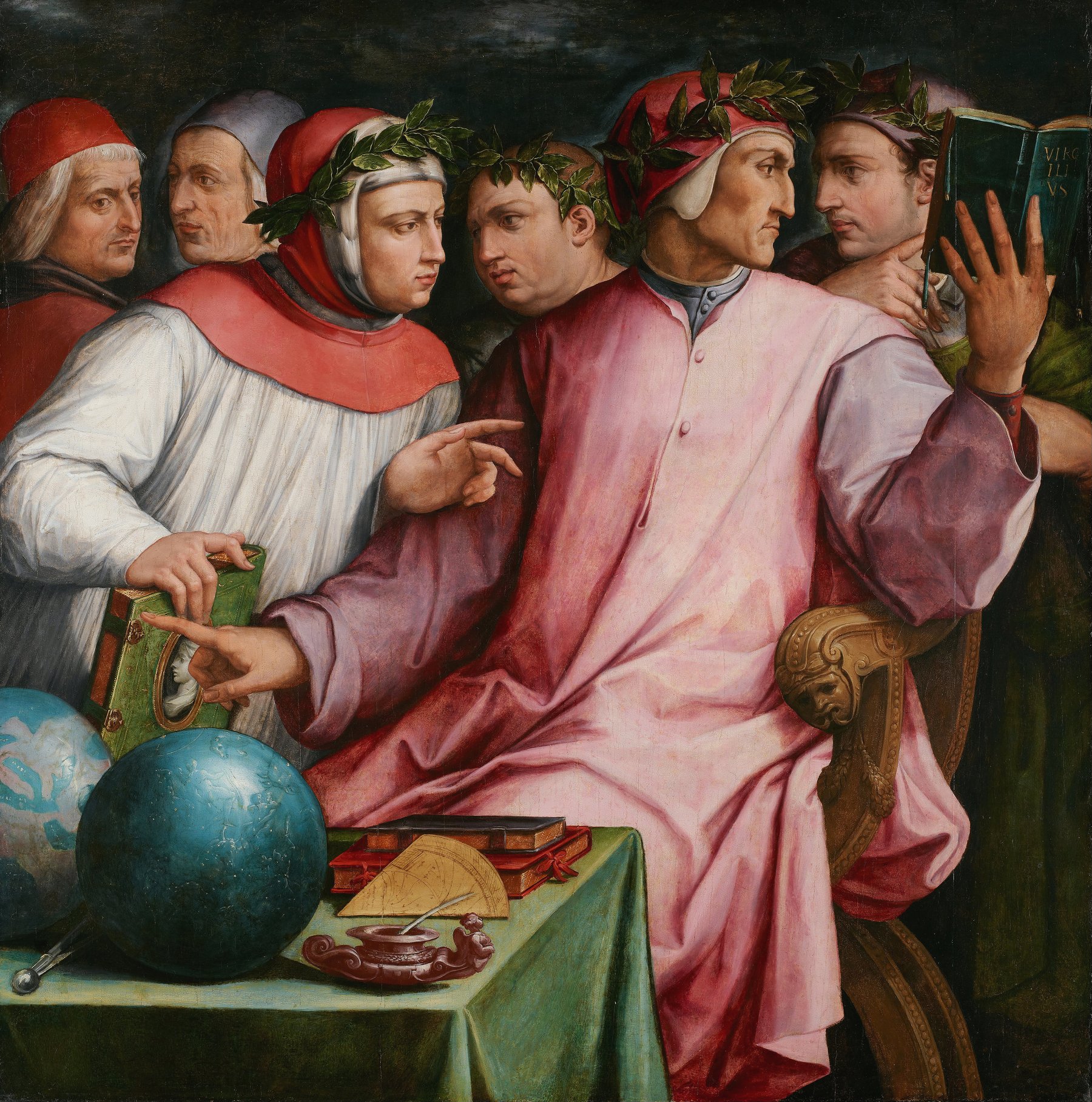 Джорджо Вазари — флорентийский живописец, архитектор и писатель, особенно известный за труд " Жизнеописания наиболее знаменитых живописцев, ваятелей и зодчих» (1550), а также фрески и маньеристский стиль, усиливающий библейские нарративы, используемые в качестве основы произведений. Задумка известной картины «Шесть тосканских поэтов» берет начало в 1543 году, когда Вазари получил заказ от итальянского академика Луки Мартини создать произведение визуального искусства, заявляющее о культурном превосходстве Тосканы и помогающее возвысить итальянский язык над латынью как язык итальянской культуры. В 1544 художник завершил работу над картиной, в которой воплощены внешние черты шести значимых тосканских литераторов и их интеллектуальный и духовный мир.