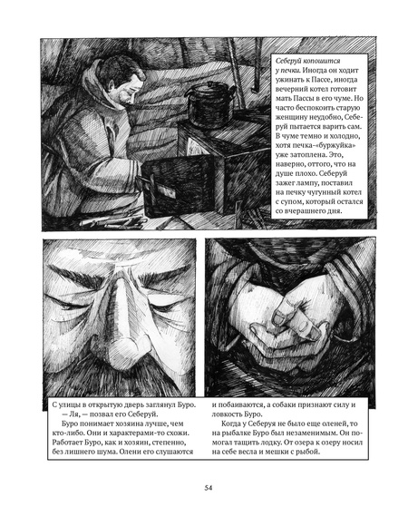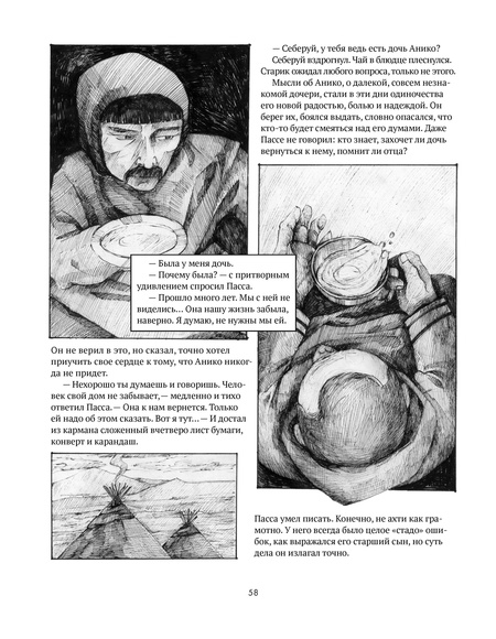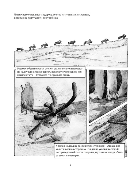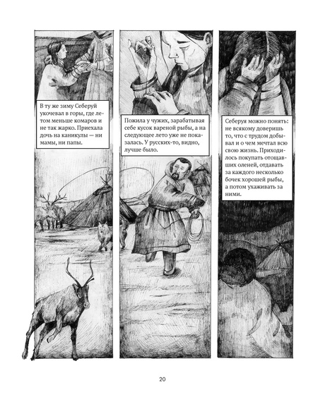 «Главное, что я хотела увидеть — это природа. Ведь именно она сделала ненецкий народ таким, какой он есть — молчаливым, гордым, вдумчивым… Связь с природой делает человека сильным. Природа определила стиль иллюстраций — графика как нельзя лучше подошла к бескрайним занесенным снегом просторам, горам, покрытым шкурами чумам, длинноногим оленям, просторному небу…» — рассказывает Полина Сайфуллина для онлайн-платформы «Мастера Сибири», художница, которая занималась отрисовкой комикса по рассказу Анны Неркаги.