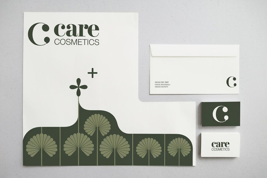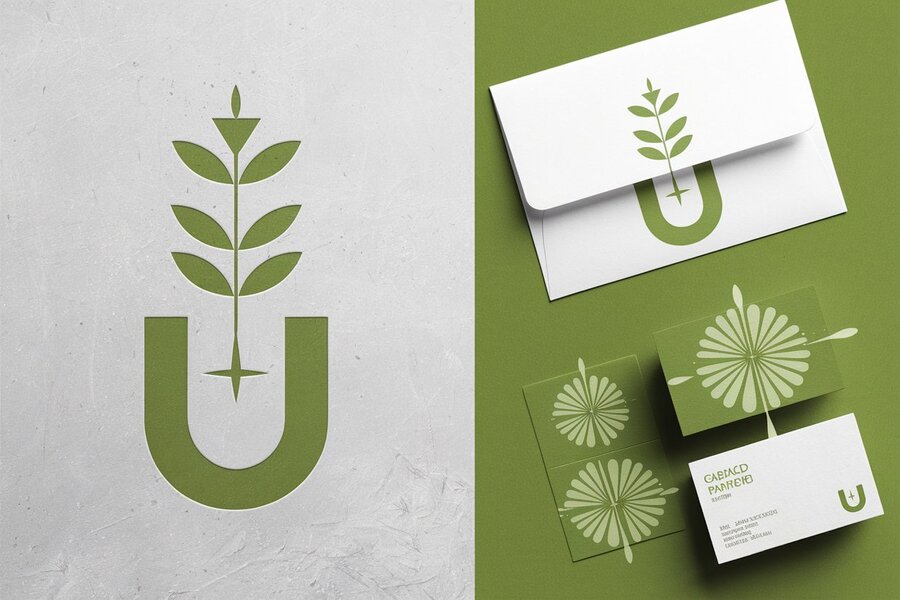 /imagine prompt: create a layout of printed products (paper, envelope, business cards) on a white background for the brand of care cosmetics U+ a combination of white and green colors, the text and logo «U» are depicted on printed products, a «+» sign of the same width is required above it, a plant grows out of the «+» sign, gracefully bending. The stem is decorated with oval leaves and ends with radial graphic flowers in the shape of a star with long petals.