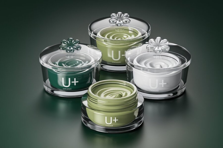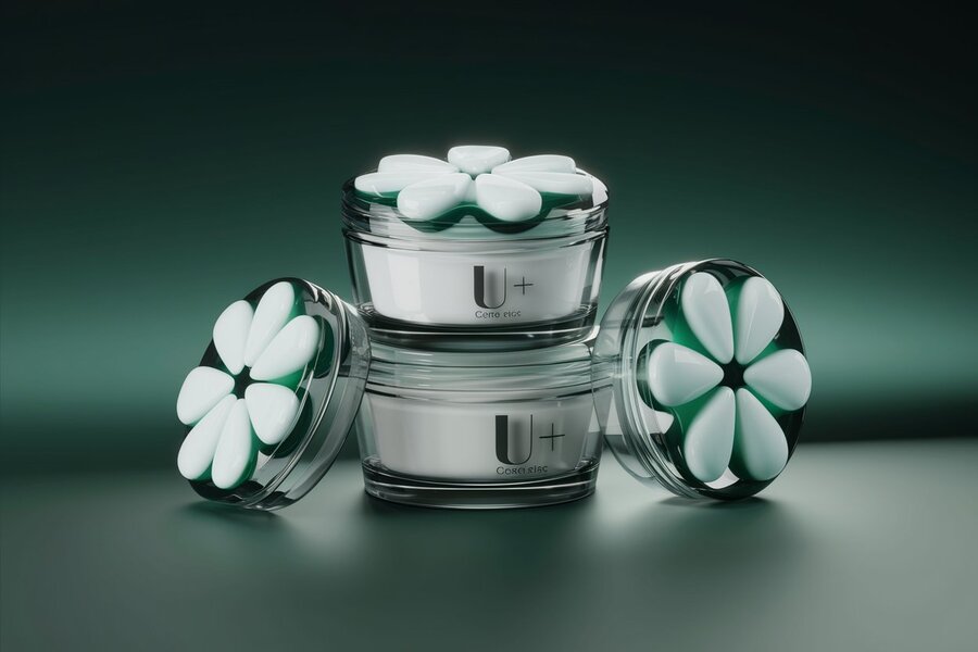 Промт для упаковки: create a 3D rendering of 3 models of transparent glass jars of cosmetics with a flower lid for the U+ brand of care cosmetics use green and white colors on a dark green gradient background