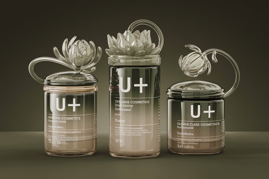 Промт для упаковки на полке: A 3D image of transparent glass jars with cosmetics with a lid in the form of a figured flower for the cosmetics brand U+ care, displayed on the shelf of a cosmetics store. The bottles have a minimalistic design. The green and white colors of the bottles are located next to other cosmetics packages. The overall atmosphere of the image is warm and modern.