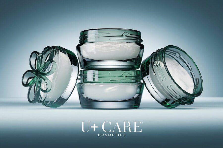 Промт для рекламной интеграции: create a 3d rendering of 3 models of transparent glass jars of cosmetics as an advertising material with a lid in the form of a curly flower for the brand of U+ care cosmetics use green and white colors on a white gradient background