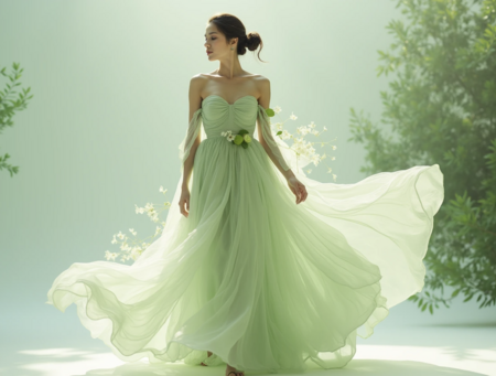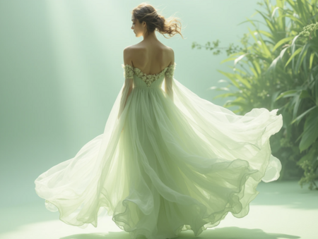 Промт для платья: «Create a flowing, airy dress design that looks light and transparent, inspired by nature. The dress should look as if it is floating in the air, with soft, organic shapes and layers, Use delicate green and white tones that will suit the line of skin care products based on natural ingredients. The material should look almost weightless, for example, chiffon or organza, with elegant details in the form of leaves or grass. The overall look should be natural, fresh and elegant, which corresponds to the concept of beauty in harmony with nature.»