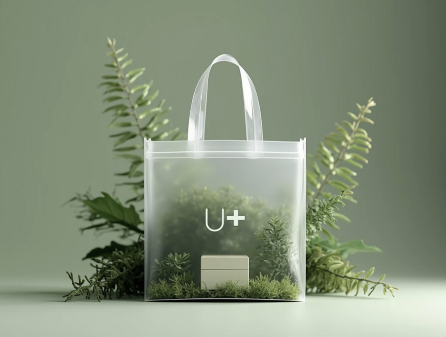 Промт для сумки: To design a stylish and modern transparent bag for the U+ skin care brand. elegant and minimalistic appearance. Around the plant, the plants should be soft and organic in style, emphasizing the brand’s emphasis on natural beauty and environmental friendliness. add transparent handles to the bag."inside the bag of a box with cosmetics, the green logo «U+» is depicted on the bag.