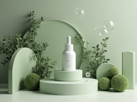 Промт для витрины, как и для пространства, сгенерирован с помощью ChatGpt в Krea.ai: Create an elegant storefront display for a natural skincare brand, U+. The showcase should feature soft green tones, circular and geometric elements for a modern, organic aesthetic. Highlight the brand’s eco-friendly philosophy with natural accents like lush green plants, ivy, and moss-covered spheres. Use reflective materials like glass or polished metal to enhance a clean, premium feel. Center the skincare product on a pedestal, surrounded by floating bubbles to emphasize purity and lightness. Ensure the U+ branding is subtly integrated into the design, maintaining a serene, minimalistic ambiance that draws attention to the product while reflecting natural beauty and sophistication. Промт для анимации в minimax.ai: The objects are moving slightly