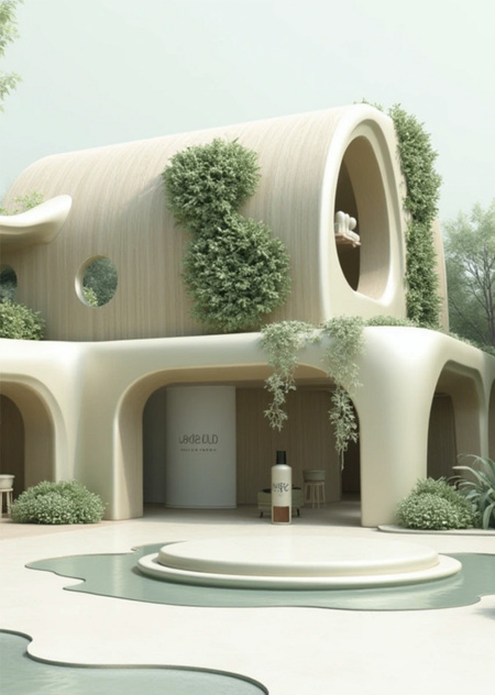 Промт для здания сгенерирован с помощью ChatGpt в Krea.ai: Design a modern architectural concept for a flagship store of a natural skincare brand, U+. The building should exude harmony with nature, featuring a seamless integration of organic and contemporary elements. Use curved shapes and flowing lines to evoke a sense of softness and purity. Incorporate materials like glass, light wood, and stone to emphasize sustainability and transparency. The facade should include vertical gardens or ivy-covered walls, along with expansive windows that invite natural light. Add minimalistic branding with the U+ logo subtly displayed. Surround the building with landscaped areas filled with native plants, water features like reflecting pools or fountains, and comfortable outdoor seating to create an inviting and eco-friendly atmosphere.