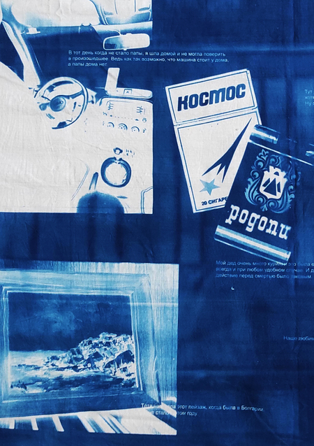 Самое тяжелое осознание при встрече со смертью — понять, что человека нет. В это не хочется верить до последнего, так как все напоминает о нем. Остаются его вещи, которыми он пользовался каждый день или которые были связаны с его увлечениями. Эти предметы всегда будут напоминать о том, что человек был. И эти напоминания приносят не грустные мысли, а наоборот, заставляют вспомнить о счастливых моментах, проведенных с умершим. Я связалась с людьми, которые пережили потерю близкого человека и попросила вспомнить о вещи, напоминающей о нем, а также написать пару слов о том, почему они выбрали именно этот предмет. Фотографии этих предметов и их истории были распечатаны в технике цианотипии на ткани размером 1×1м. Такая техника дает глубокий синий оттенок и изображения не всегда получаются четкими, что придает более выразительный вид фотографиям и тексту. Фотографии и истории не отделены друг от друга, а собраны вместе. Со стороны может создаться впечатление будто рассказ ведет один человек. Мне было важно показать это именно так, потому что смерть близких людей — это то горе, которое связывает всех нас.
