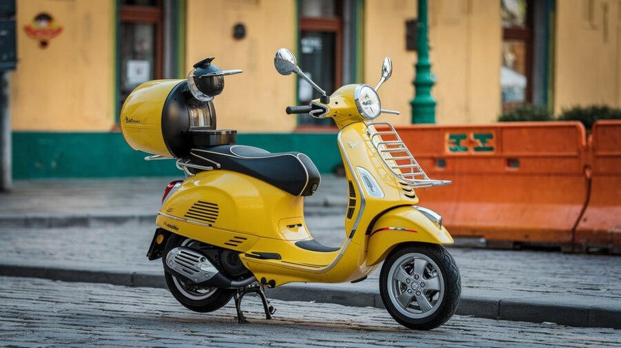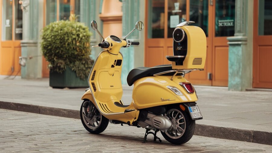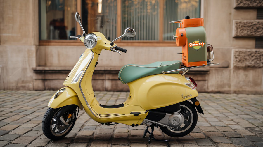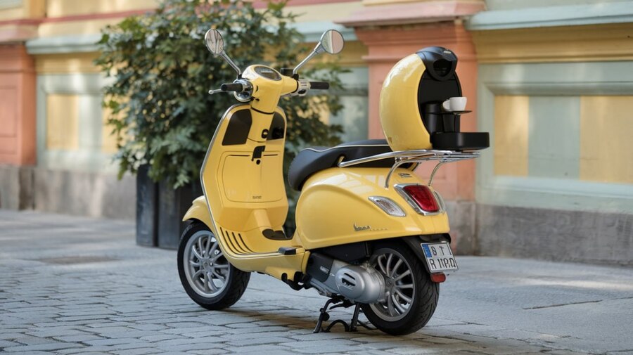 /imagine prompt: Yellow vespa moped with built in coffee machine on the back of the body, realistic exhibition photo, nice lighting. Main colors orange-yellow light greenish-blue orange Crayola olive green Crayola olive green