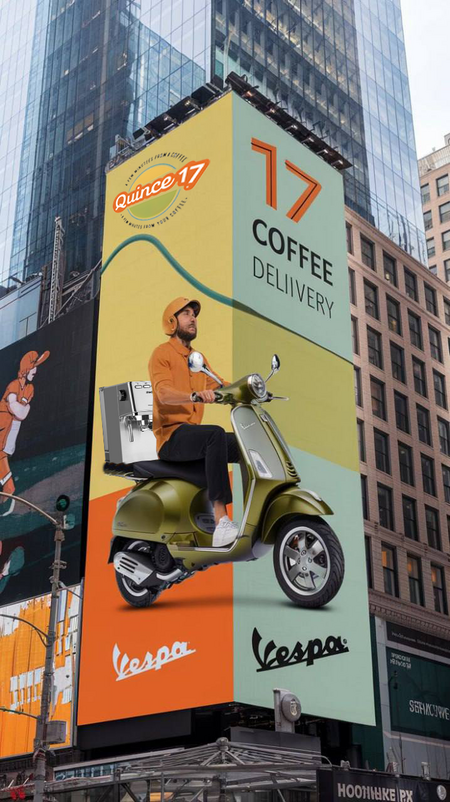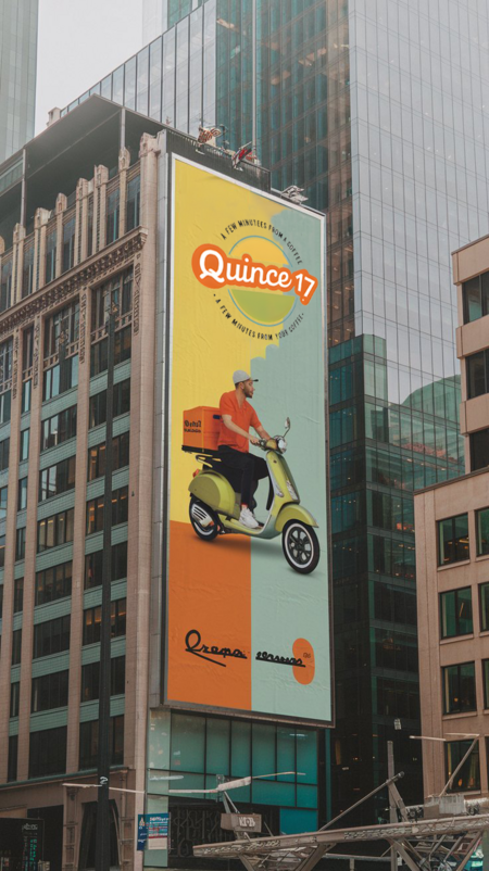 /imagine prompt: Large poster on a skyscraper in a modern city on times square advertising Quince 17 coffee delivery, with the delivery man riding a vespa moped. Main colors: orange-yellow, light greenish-blue, Crayola orange, Crayola olive green.