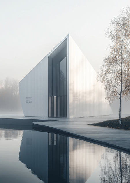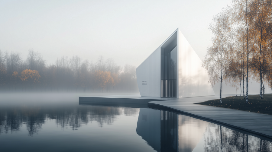 промт midjourney: a white and metallic memorial building in the form of a silhouette of the city’s foundation in the centre of Rybinsk Reservoir named The Silent River Memorial, sunny foggy weather, hyperrealistic --ar 16:9