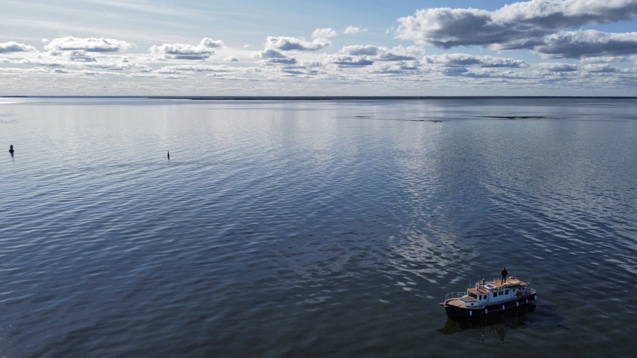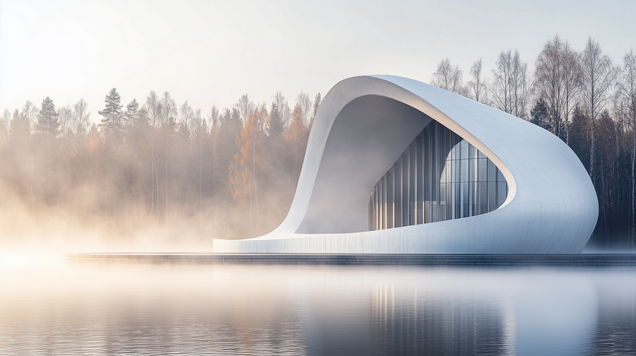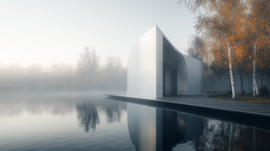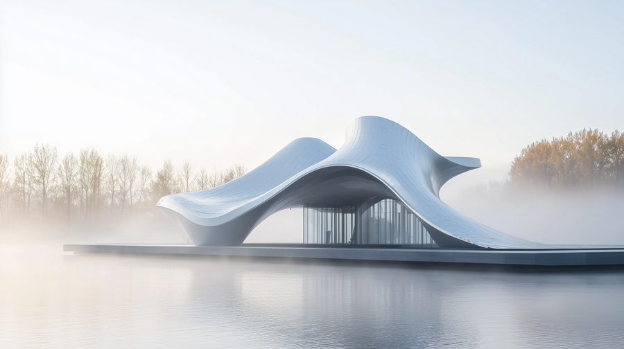 промт midjourney: a white and metallic memorial building in the form of a wave in the centre of Rybinsk Reservoir named The Silent River Memorial, sunny foggy weather, hyperrealistic --ar 16:9