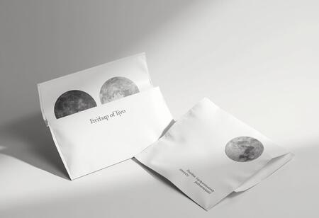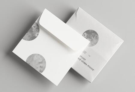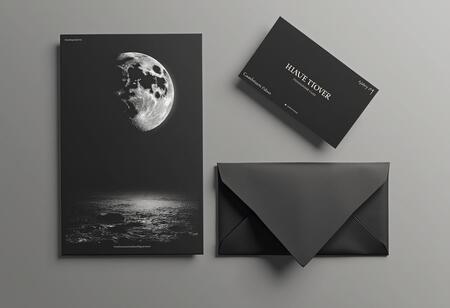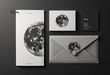 prompt: using grayscale Colors generate a minimalistic mockup of printed materials (paper, envelope, business cards) place moon, text and other graphic