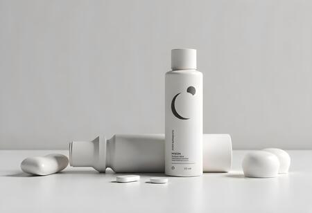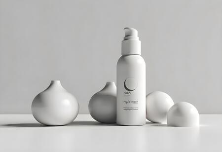 prompt: A white cosmetic bottle with a white cap, moon logo and half-circles, surrounded by white objects on a plain background