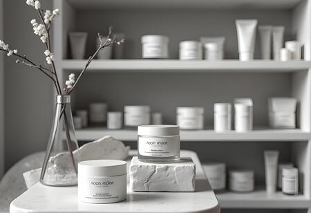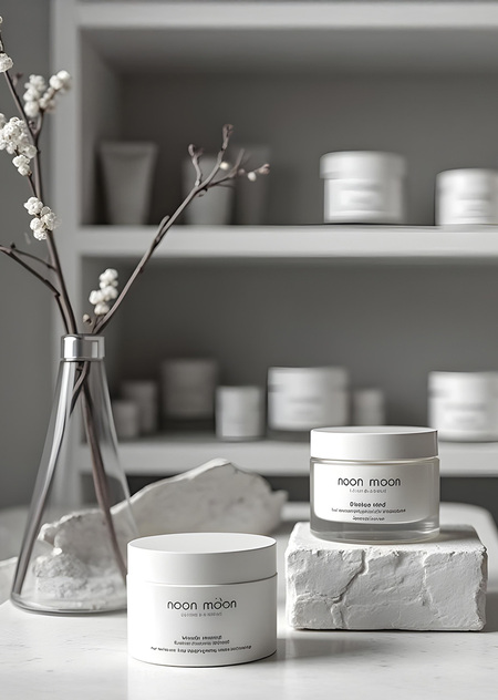prompt: generate a retail space in a cosmetics store, where minimalist cosmetic jars of a beauty brand «noon moon» are displayed on the shelves