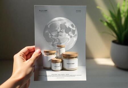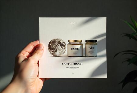 prompt: candid image, photography, natural textures, highly realistic light, editorial, mockup flyer with A moon with the text «moon moon» and other text printed on a white paper, held in a human hand