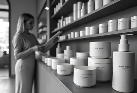 prompt for right pic: generate a retail point with seller in a cosmetics store, where minimalist cosmetic jars of a beauty brand «noon moon» are displayed on the shelves, use grayscale colors