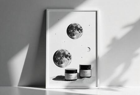 promt for left pic: generate a retail point in a cosmetics store, where minimalist cosmetic jars of a beauty brand «noon moon» are displayed on the shelves, use grayscale colors