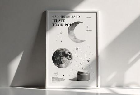 prompt: genetare advertising poster with graphic design for cosmetic brand «noon moon», place on poster a minimalistic cosmetic can, half-moons, half circles, text and other graphic elements