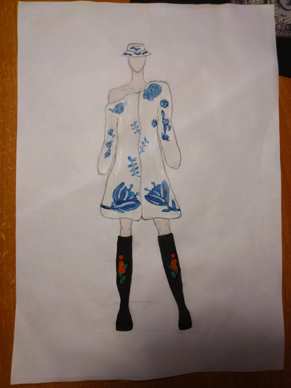 Перед вами изображена модель, Гжелевская дама, которая очень любит создавать контрасты в своем стиле, и для которой одежда в стиле русской народной культуры примеряется впервые. На ней сидит белая норковая шуба с синими узорами, которые напоминают о гжелевском искусстве. Как и ее атрибут на голове, представляющий собой обыкновенную панаму с таким же дизайном и мотивом. На ногах у модели черные ботфорты с русско-народными узорами. Белый верх и черный низ создают грациозный контраст.