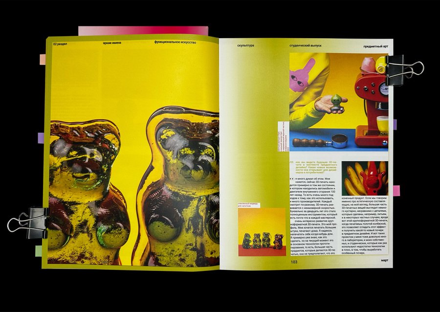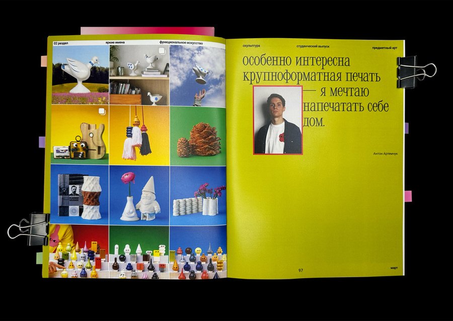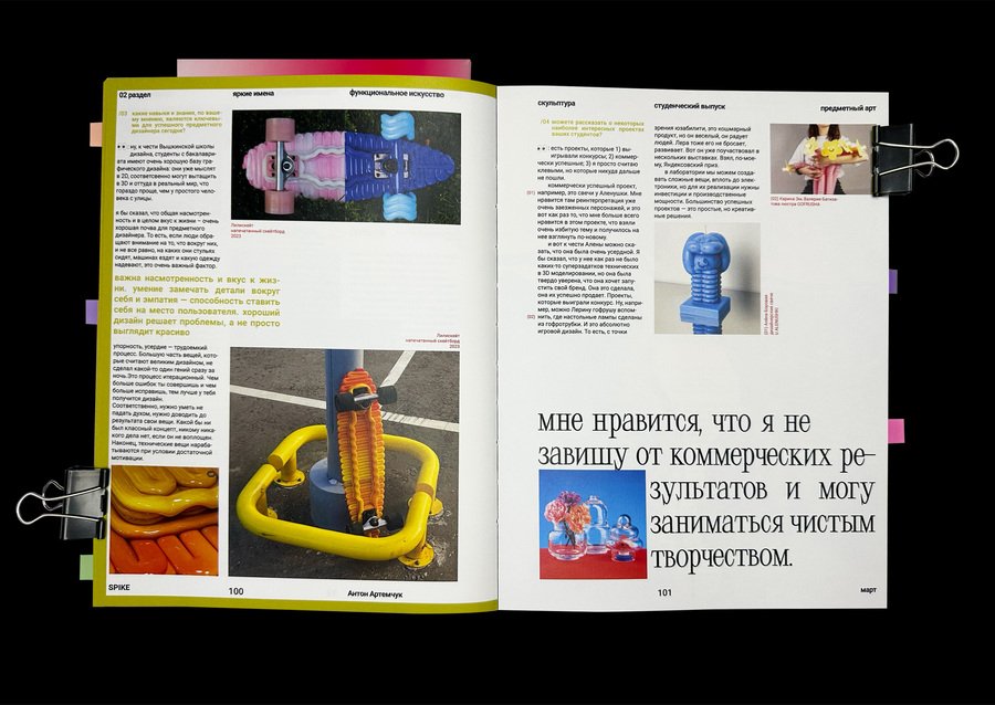 так, можно прочитать интервью с Маргаритой Варакиной, художницей современного искусства, совмещающей 3д и живопись, Полиной Эче, первокурсницы коммуникационного дизайна, Антоном Артемчук, неоинженером и преподавателем предметного дизайна, Vivato Eka, участницей открытых студий Винзавода, и командой дизайн-продакшн Detki выпускников Школы Дизайна.
