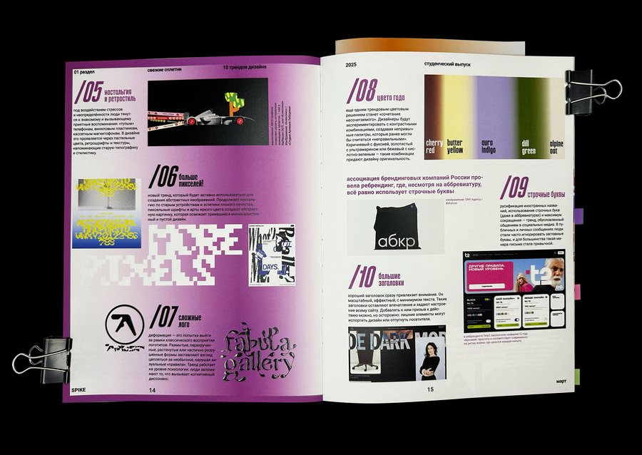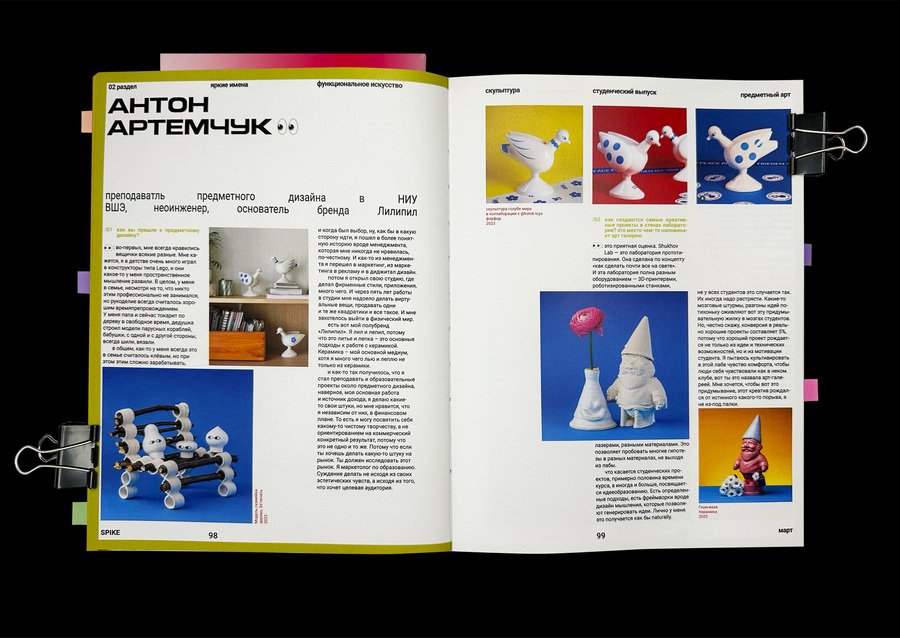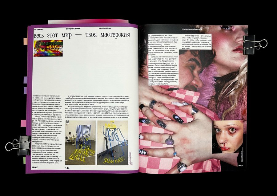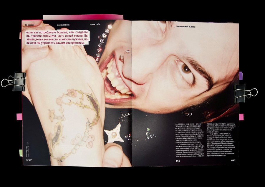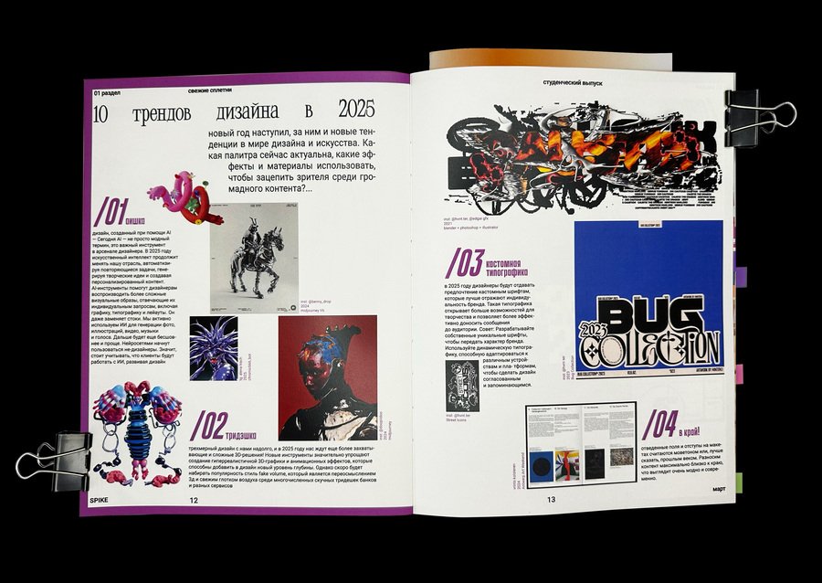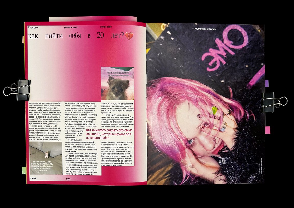 spike — новое медиа для зумеров о современном дизайне, искусстве и их взаимосвязи. Издание нацелено на открытие молодых дизайнеров и художников, стремящихся выражать себя через яркий и необычный образ. Журнал как друг, поддерживающий эксперименты и выход за рамки привычного.