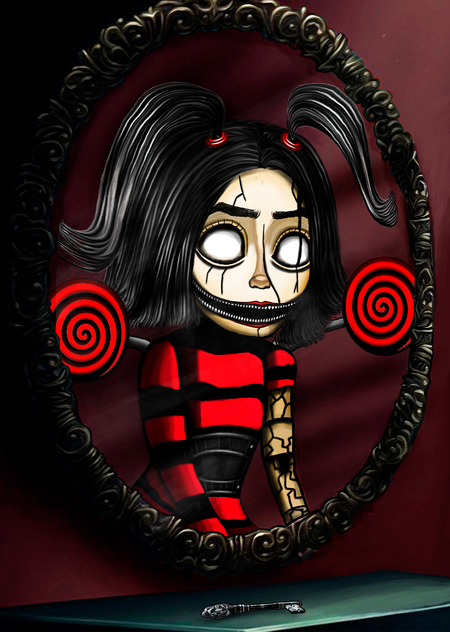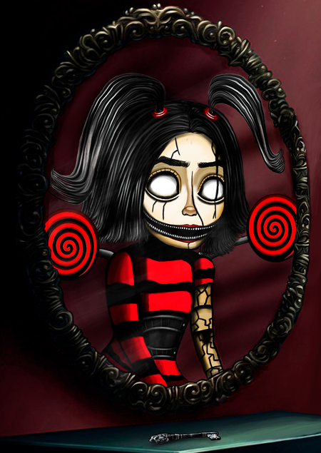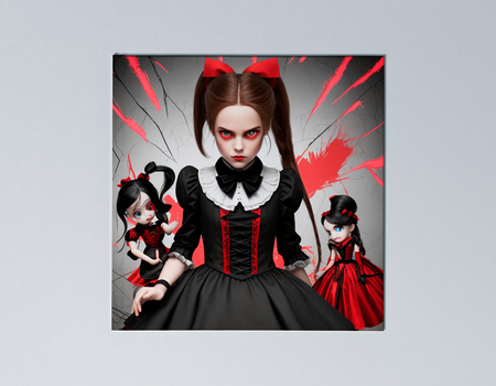 prompt: generate me a game chip for a board game in the style of the scary Alice in Wonderland with two ponytails in a black and red dress in the form of a doll