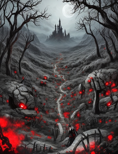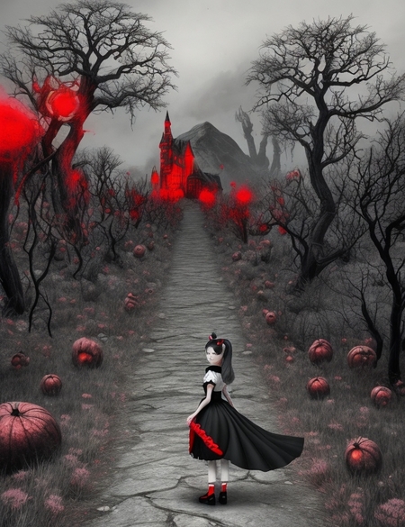 prompt: Generate me a scary landscape for a computer game that depicts Alice in Wonderland with two ponytails in a black and red dress with red eyes