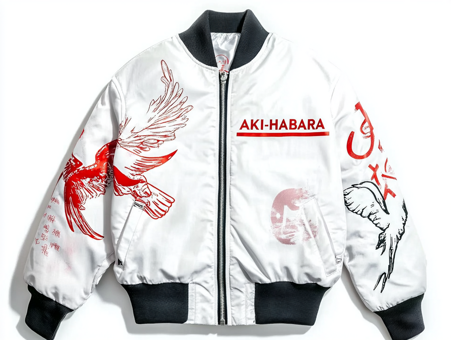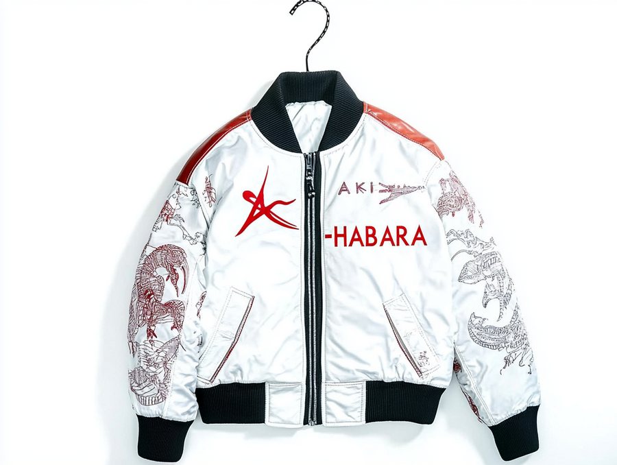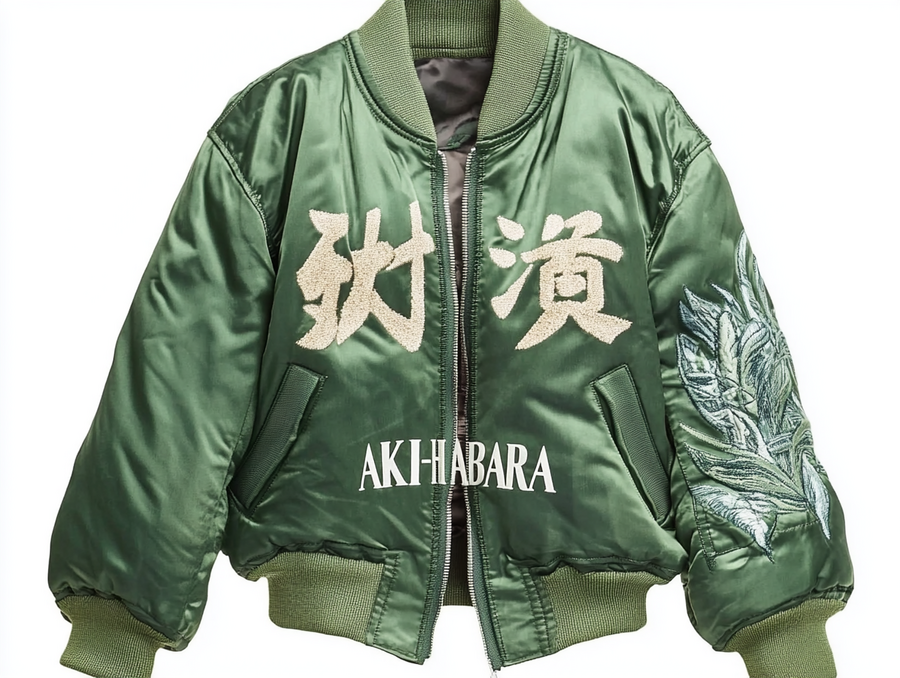 green jacket with logo «AKI-HABARA» on the white background--chaos 100 --ar 4:3 --stylize 1000 --weird 3000 jacket with logo «AKI-HABARA» on the white background--chaos 100 --ar 4:3 --stylize 1000 --