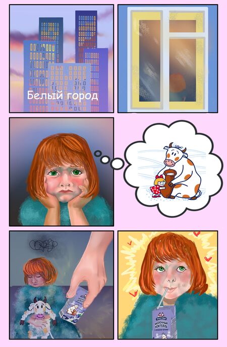 Белый город сияет не только чистотой улиц, но и радостными лицами довольных потребителей. Один из таких изображен в моей работе. Иногда света в жизни не хватает, и помочь может только маленькая радость, например — молочный коктейль.