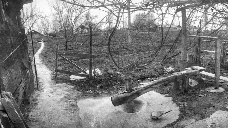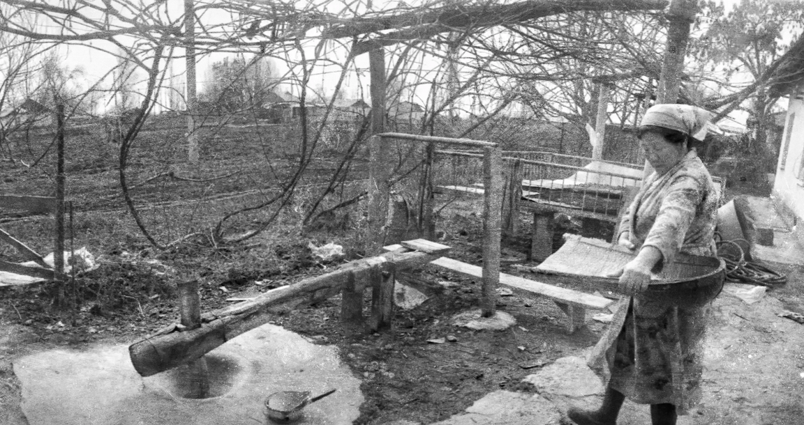 Фотография ножной ступы для перемолки зерна в бывшем колхозе им. А. Микояна. Среди корё-сарам технология утеряна. // Виктор Ан. Ташкент, Узбекистан, 1993.