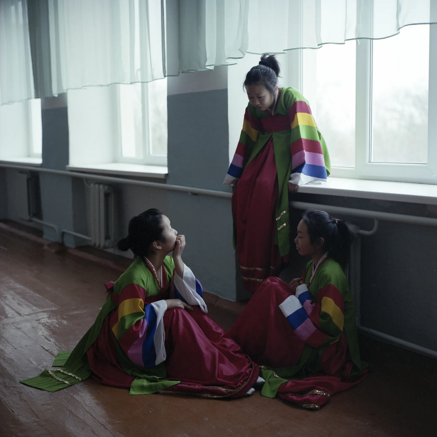 Две сестры, Настя и Света Нам, в традиционном ханбоке. М. В. Ким, Уштобе, Казахстан, 2014 // Корё-сарам в традиционных нарядах после репетиции в первом языковом центре Казахстана. М. В. Ким, Ескельди би