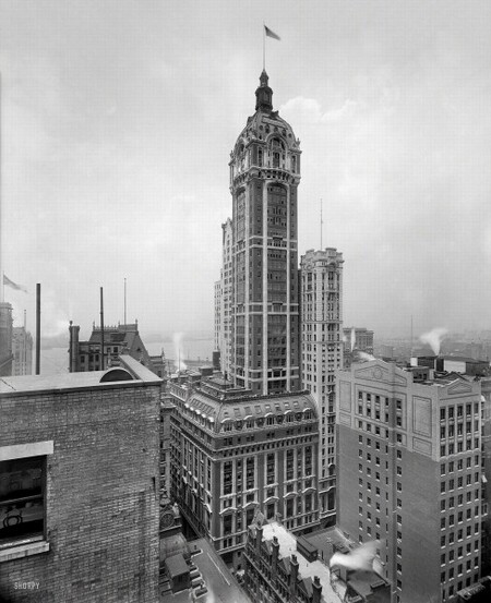 Слева: The Singer Building, Нью-Йорк // Справа: Женщина за швейной машинкой, конец XIX века