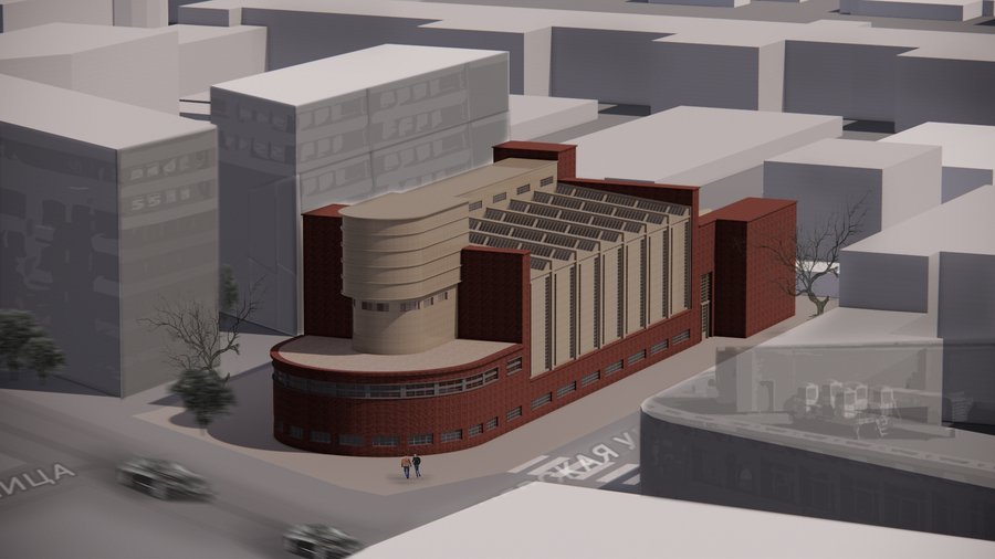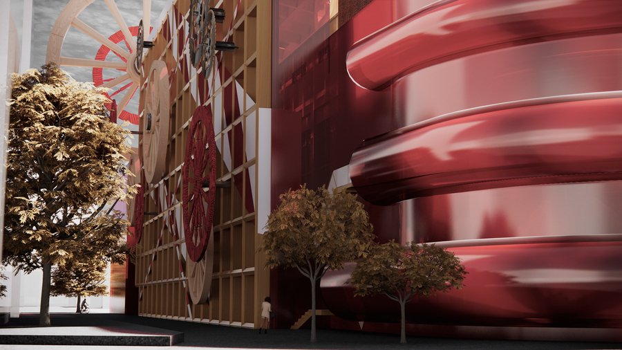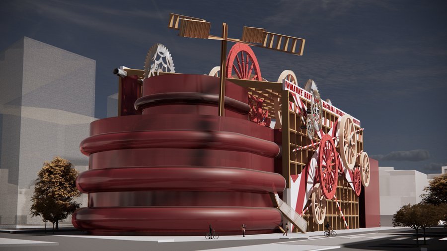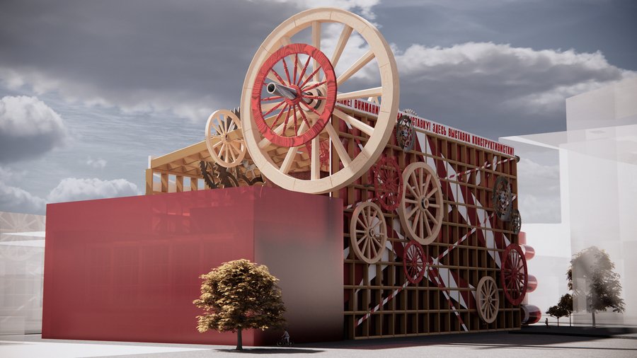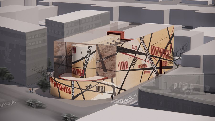 Временный фасад здания превращается в динамичную композицию, вдохновлённую работой «Пространственно-силовое построение» (1921) и авангардными агитационными плакатами.