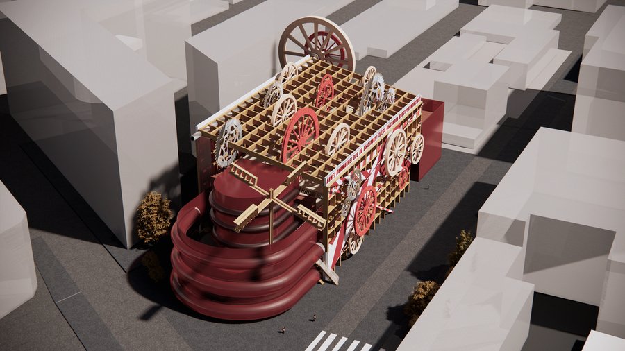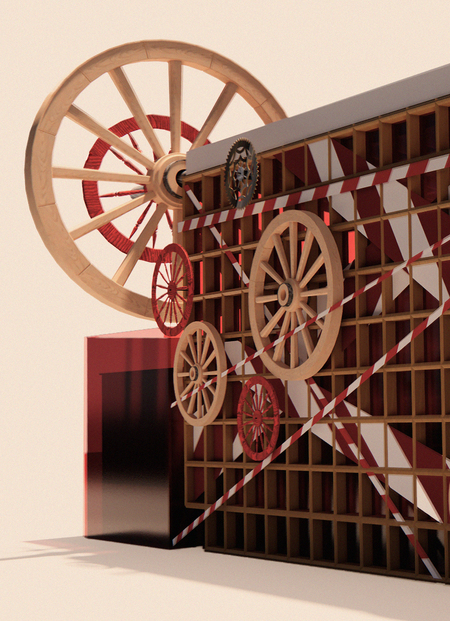 Архитектурная временная конструкция отсылает к сценографическим решениям художницы, а также к эстетике индустриального строительства 1920-х годов, превращая архитектуру в подвижную кинетическую инсталляцию.