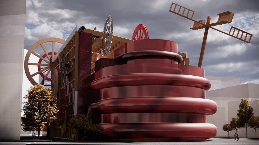 Фасад будет находится в постоянном движении: вращающиеся механизмы, бегущие строки, движущиеся элементы создают эффект индустриальной среды, в которой конструктивисты видели будущее искусства.