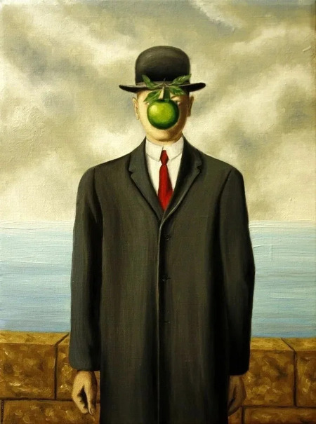 Магритт предпочитал более минималистичный и символичный стиль, используя простые композиции и концептуальные идеи. В «Ключе к счастью» он изображает открытый ящик с ключом, символизирующий тайну и возможность открытия счастья, при этом оставляя пространство для интерпретации зрителя. А, например, в «Сыне человека» он изображает яблоко, будто висящее перед лицом человека, сочетая реалистичные формы с сюрреалистической концепцией скрытности и тайны.