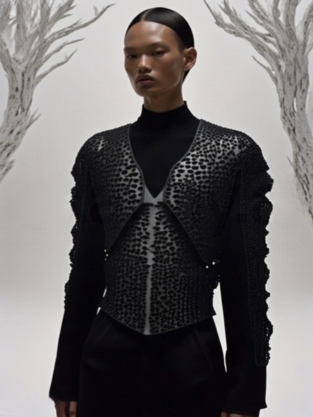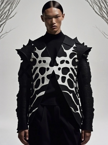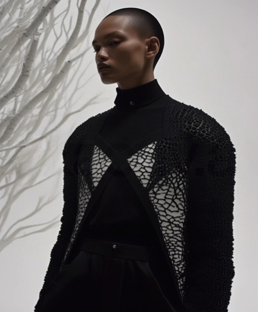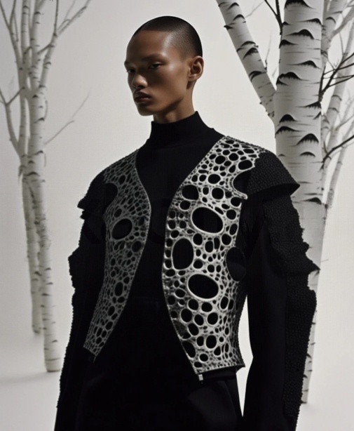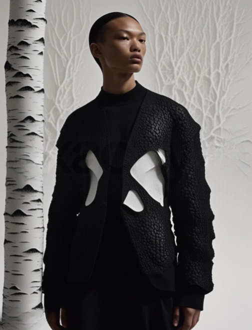 Контраст черного и белого цветов подчеркивает скульптурность форм и сложность фактур, отсылая к природным мотивам: текстуры напоминают кору деревьев, трещины высохшей земли, органические отверстия, как в камнях или древесине. Природа здесь — не только источник визуальных идей, но и философский ориентир: коллекция исследует, как биомиметика и природные структуры могут быть переосмыслены в технологичном и устойчивом контексте современного дизайна одежды.