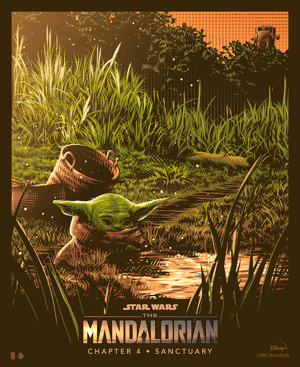 Постер «Ponyo» выполнен в спокойных синих тонах, создавая атмосферу волшебства и спокойствия, а изображение медуз подчеркивает тему природы. В «The Mandalorian» насыщенные оранжевые и синие тона создают атмосферу приключения, а изображение персонажа на фоне заходящего солнца подчеркивает тему одиночества и решимости. В другом постере «The Mandalorian» изображение малыша Йоды в окружении природы создает атмосферу спокойствия и гармонии.
