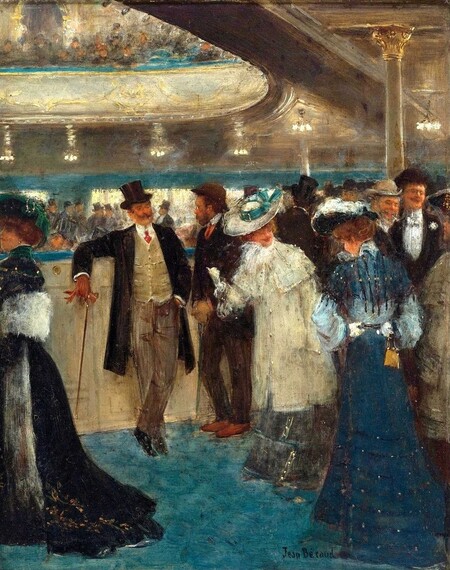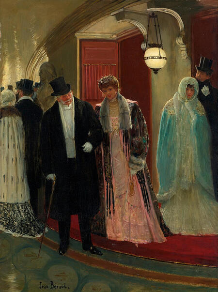 В картинах Жана Беро зрители превращаются в главных героев. Фигуры людей изображены не во время спектакля, а в промежуточных зонах — фойе, галереях, на лестницах — где продолжается социальное представление. В «Выходе из ложи» женщина в вечернем платье становится объектом внимания: она словно сходит со сцены, участвуя в визуальной игре взглядов. В «Галерее» персонажи не смотрят на сцену, а демонстрируют себя — они сами становятся частью театрального зрелища. Эти сцены показывают, как публика превращается в спектакль, а театр — в отражение буржуазной визуальной культуры.
