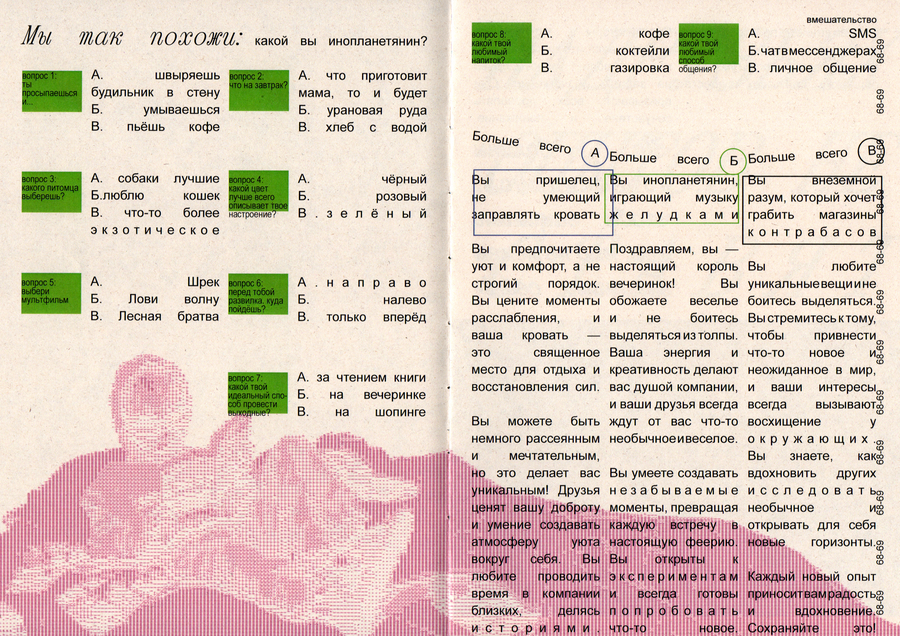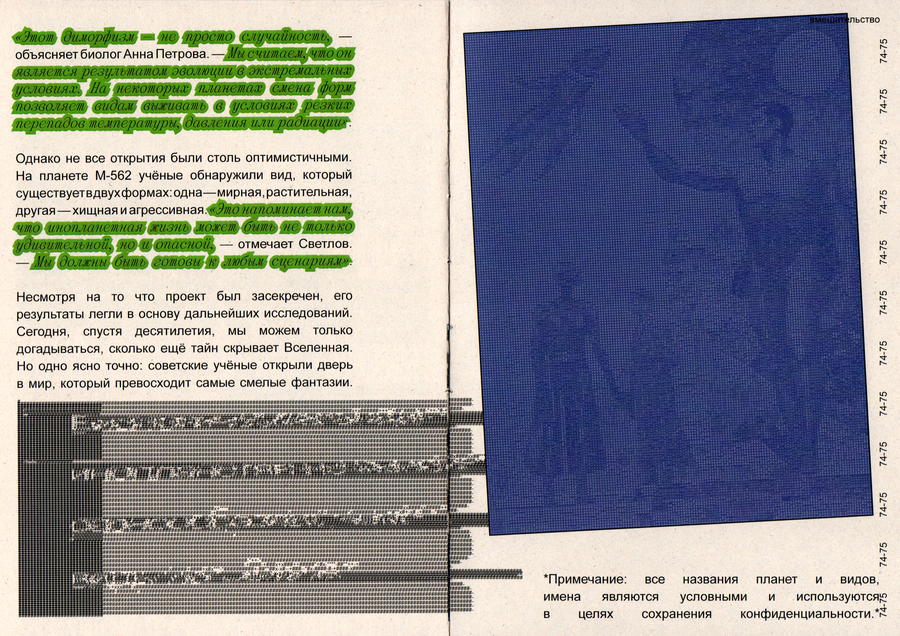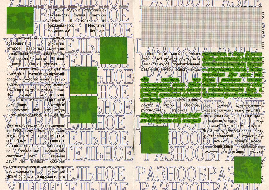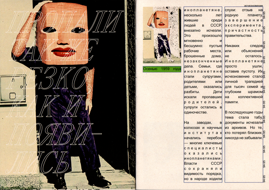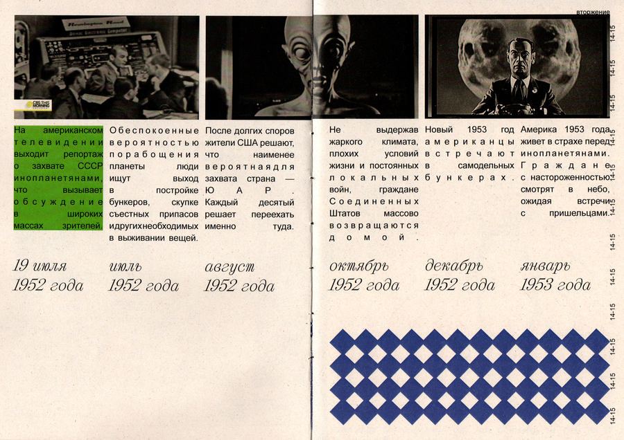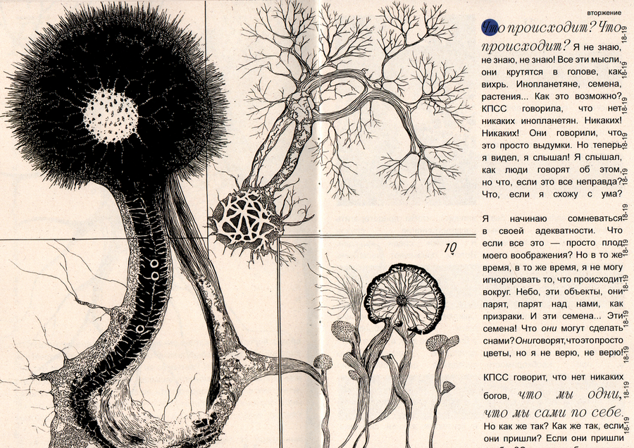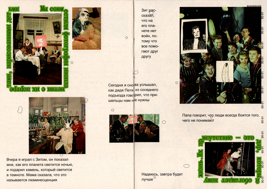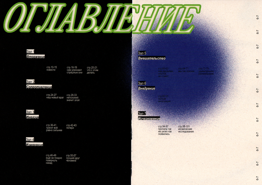 Мы поделили рассказ на 7 частей: вторжение (инопланетян), сопротивление (со стороны ЦК КПСС), инвазия (пришельцев в общество), изменение (политики отношения к ним), вмешательство (в тела внеземных гостей), внедрение (инопланетян в повседневную жизнь), исчезновение (они улетели, но куда?)