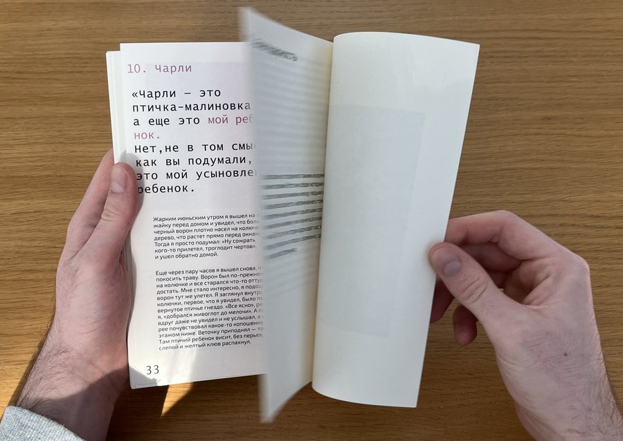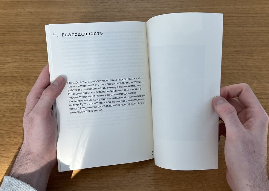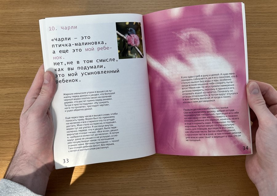 Развороты делятся по цветам: синий и розовый. Все синие развороты — истории, где главным смыслом является взаимосвязь человека и птицы;