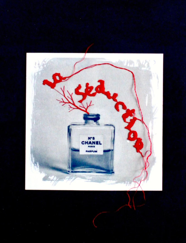 Буквы, слова и предложения теряют свой изначальный смысл, становясь фоном, орнаментом, изобразительным элементом, который рисует композицию картины. Роль вышивки здесь также более формальна, а не сюжетна. Она придает фактурность изображению, материальность и отпечаток руки создателя. Это довольно хитрый ход, который априори располагает зрителя к себе, показывая человеческий отпечаток на следах хлопкового холста.