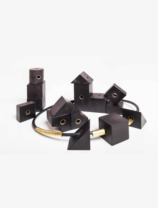 Колье- конструктор «Домик на озере» отсылает нас к докомпьютерным играм и конкретно к конструктору из деревянных кубиков. Осознанного созидательного контакта с формой и материалом зачастую не хватает современному городскому человеку. В своих работах мне важно развивать идею трансформации изделия. Одну и ту же вещь можно носить по разному на разных частях тела. Я призываю моих заказчиков активно пользоваться этой возможностью, становясь, как бы соавторами, а не холодными потребителями готового «застывшего» продукта