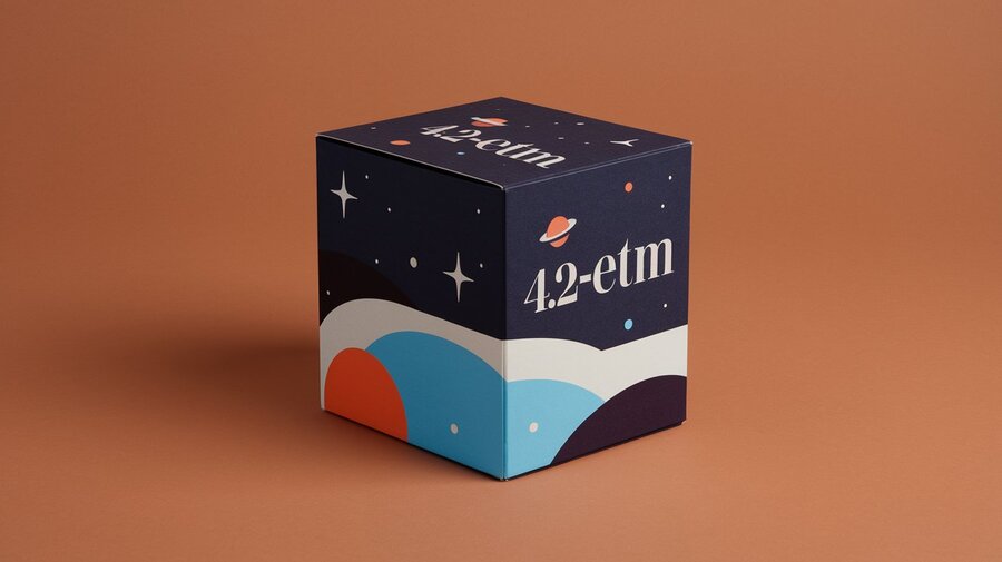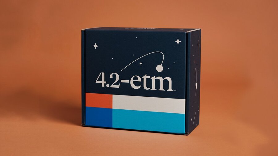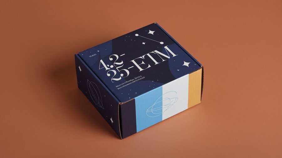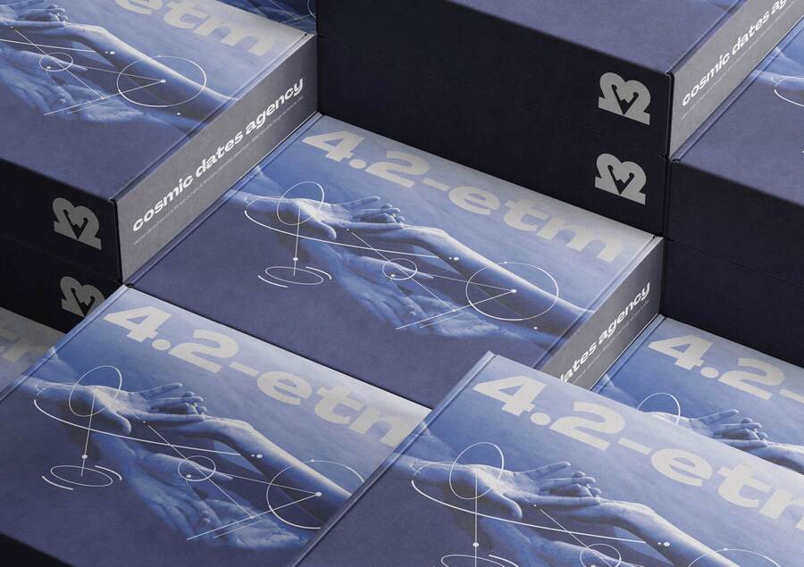 Prompt: design a branded box mock-up for the space dating agency «4.2-etm» with the name in RS125 font. The box should feature a minimalist design, using a color palette of deep blue (#1F3B73), dark blue (#193559), sky blue (#224573), light blue (#C2D7F2), and white (#F2F2F2). The design should evoke a sense of space exploration, with subtle cosmic elements like stars or planets, while maintaining a sleek, futuristic aesthetic. The overall look should be modern, elegant, and reflective of the theme of connecting people across the universe.