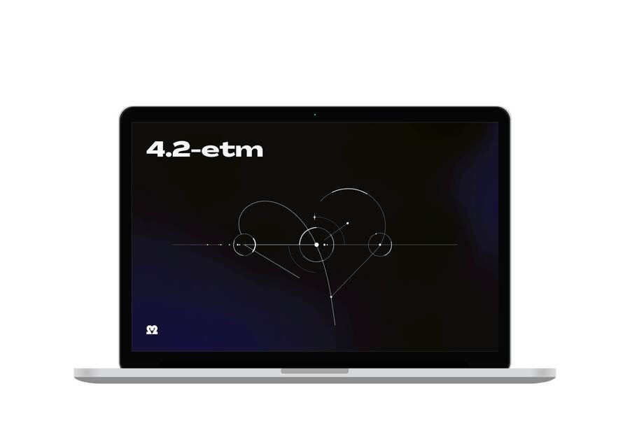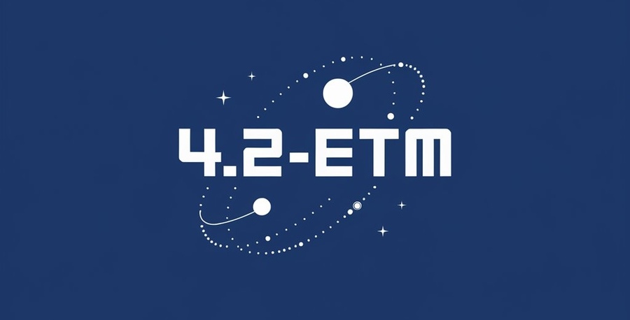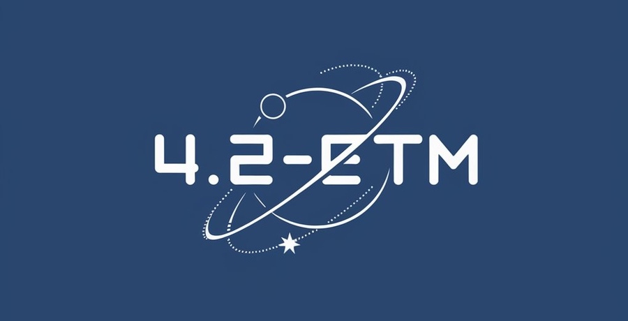 Prompt: create a minimalist logo for a cosmic dating agency with a blue background and white elements. Use simple orbital paths or connected planets to represent space exploration, with curved lines or dots symbolizing movement and cosmic connections. The name «4.2-etm» should be in a bold, wide, white font with sharp or rounded edges, spaced out for a futuristic look. Add small white stars or dots. The design should be sleek, modern, and uncluttered, emphasizing interplanetary travel and connection.