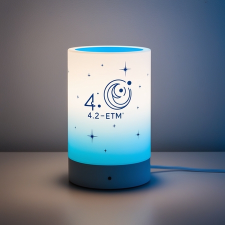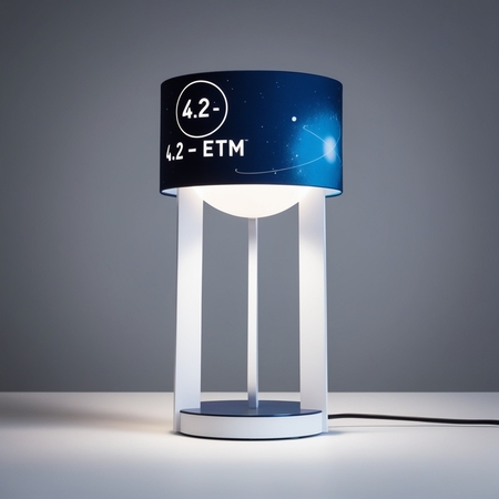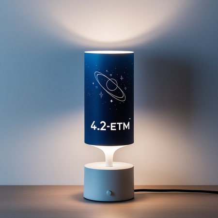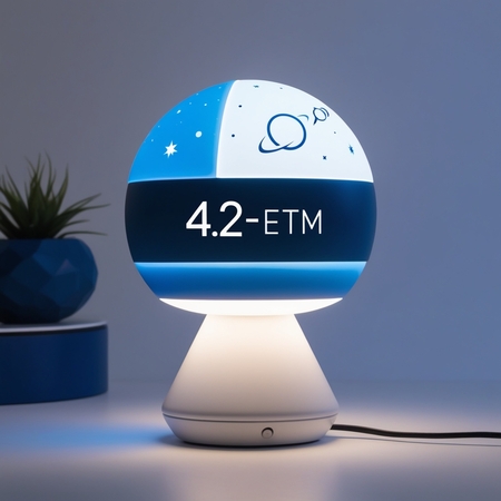 Prompt: design a sleek, minimalist lamp for «4.2-etm» with a cosmic theme. Use deep blues, light blues, and white #1F3B73, #193559, #224573, #C2D7F2, #F2F2F2. The lamp should feature subtle cosmic elements like stars or planets, and incorporate the «4.2-etm» logo in RS125 font. The design should feel futuristic, evoking space exploration, with soft, ambient lighting that complements the theme of connection across the universe.